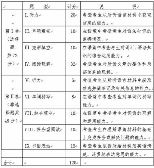 考试分听力考试和笔试两部分。先进行听力考试,再进行笔试。进行听力考试时,考生在统一时间内在考场收听录音磁带,边听录音边答题。录音带只放一遍,录音结束,听力考试即结束。考试时间为120分钟。