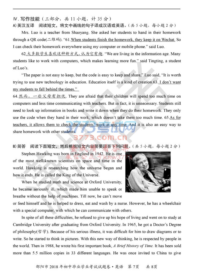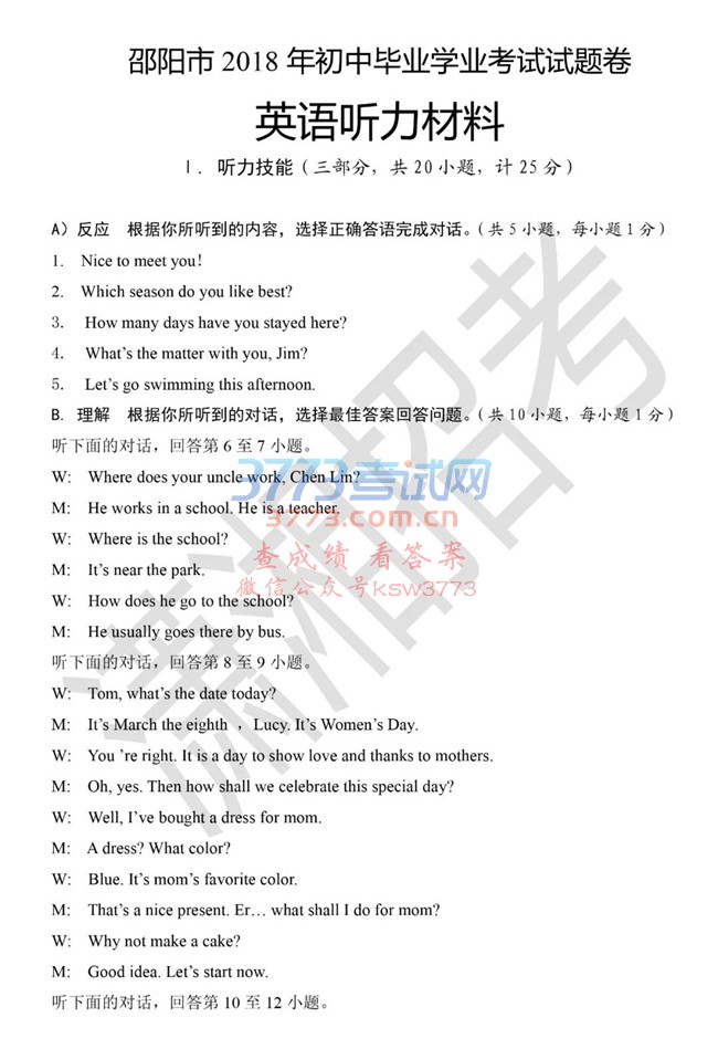 精英中考网消息:2018年邵阳中考结束,小编第一时间收集整理2018邵阳中考英语试题答案及评分标准,供广大考生参考