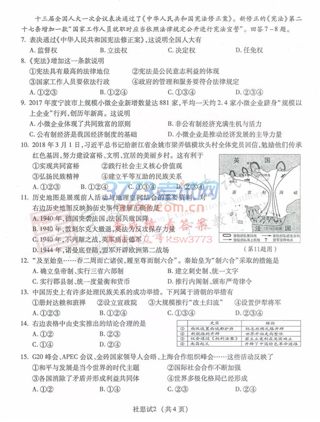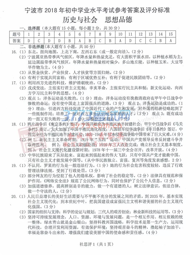 2018宁波中考历史与社会思品试题及答案评分标准发布