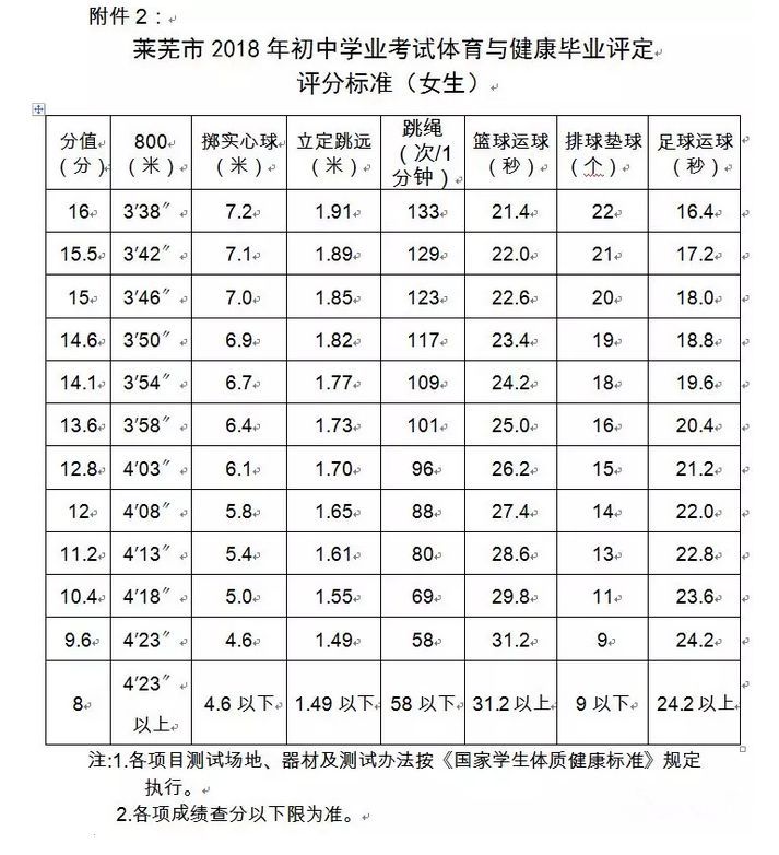 精英中考网消息:2018年莱芜市中考体育考试方案公布,2018莱芜中考体育考试评分标准如下: