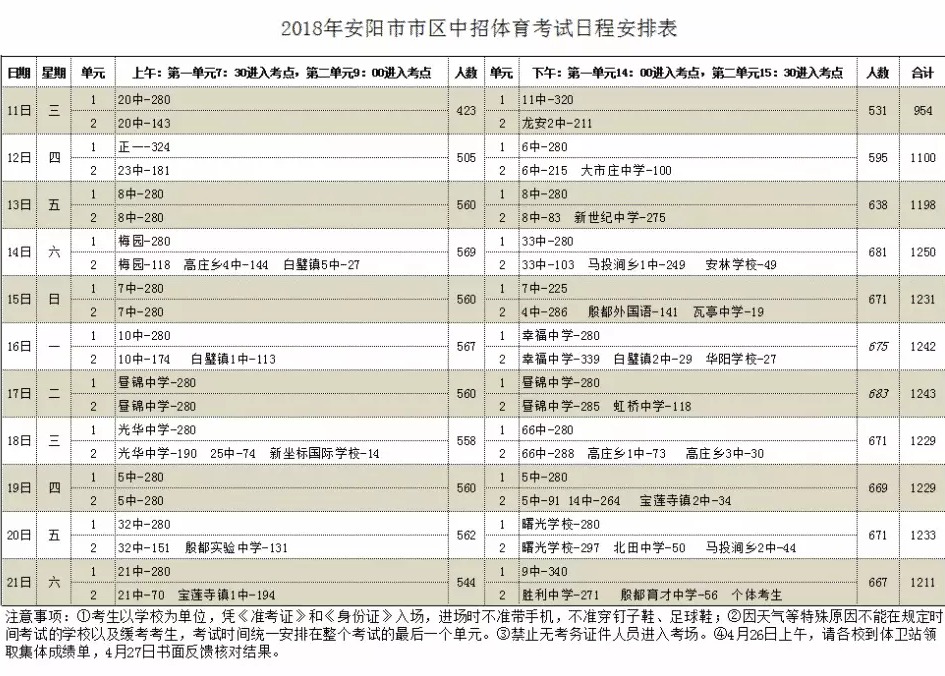 ②因天气等特殊原因不能在规定时间考试的学校以及 " 缓考考生" , 考试时间统一安排在整个考试的最后一个单元; 2018安阳中考体育考试时间日期安排