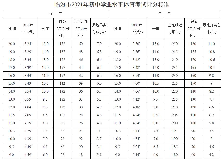 2021临汾中考体育考试项目、评分标准