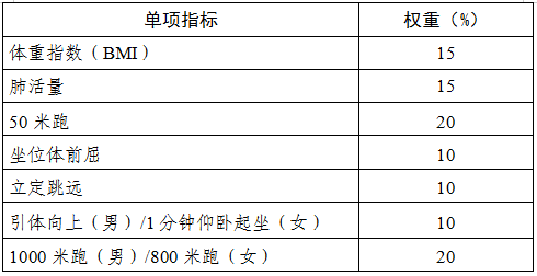 (二)体质健康测试。依据《国家学生体质健康标准(2014年修订)》,由学生所在学校负责组织测试。测试成绩满分100分,按实际得分的10%计入总分。每人共测7项。项目和权重如下表: