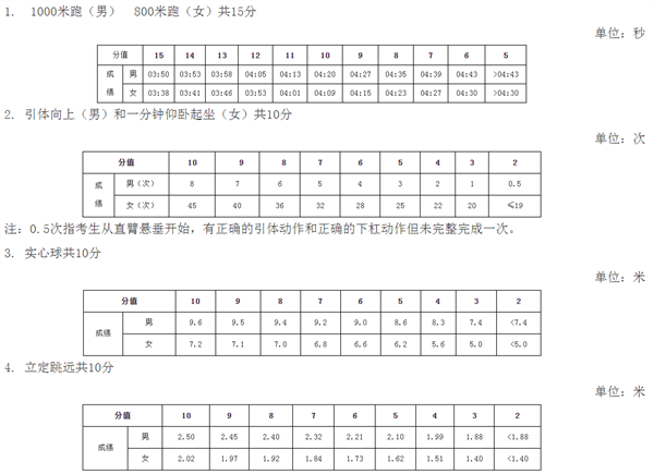 (二)引体向上(男)或一分钟仰卧起坐(女)、实心球、立定跳远、一分钟跳绳(学生自选一项,报考前确定),分值10分。