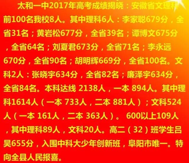 太和一中2017高考成绩喜报公布: