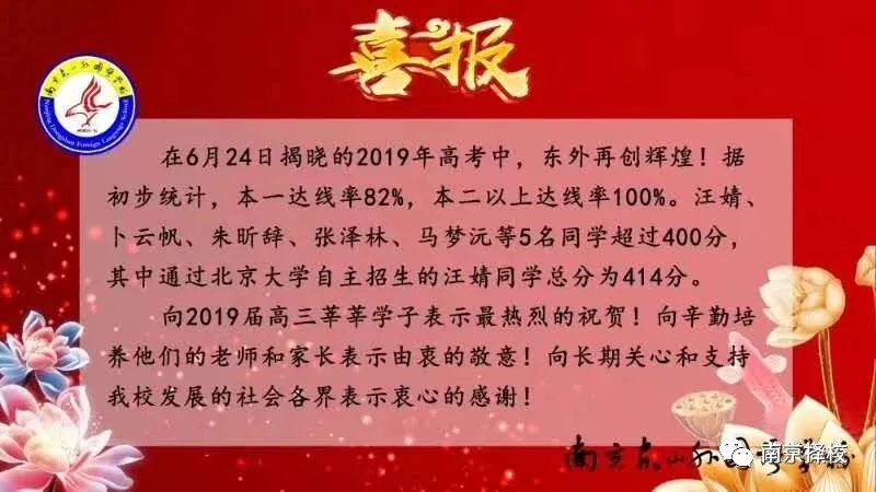 截至6月25日,据权威数据统计,2019年高考东外再创辉煌,取得“十一连冠”!学校本一达线率84.5%,连续十一年名列江宁区第一、南京市前列,又创历史新高;本二以上达线率100%。5名同学超过400分,22名同学超过390分,其中通过北京大学自主招生的汪婧同学总分为414分。