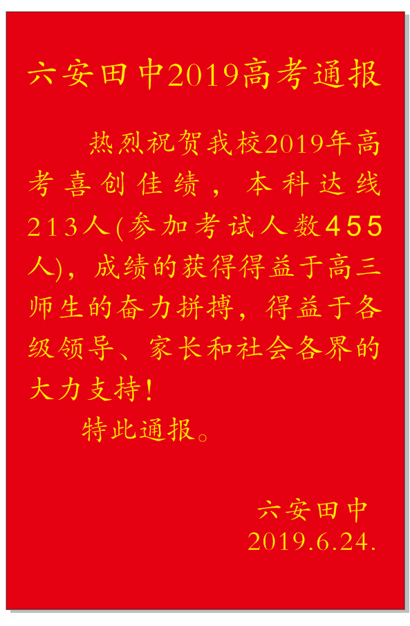 热烈祝贺我校2019年高考喜创佳绩,本科达线213人(参加考试人数455人),成绩的获得得益于高三师生的奋力拼搏,得益于各级领导、家长和社会各界的大力支持!