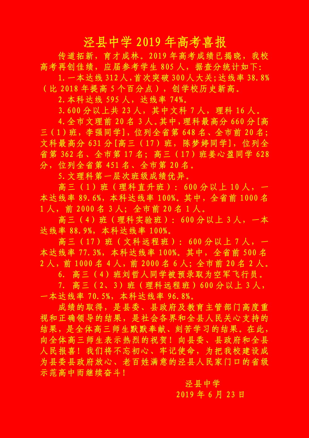 泾县中学2019高考成绩喜报、本科一本达线人数情况