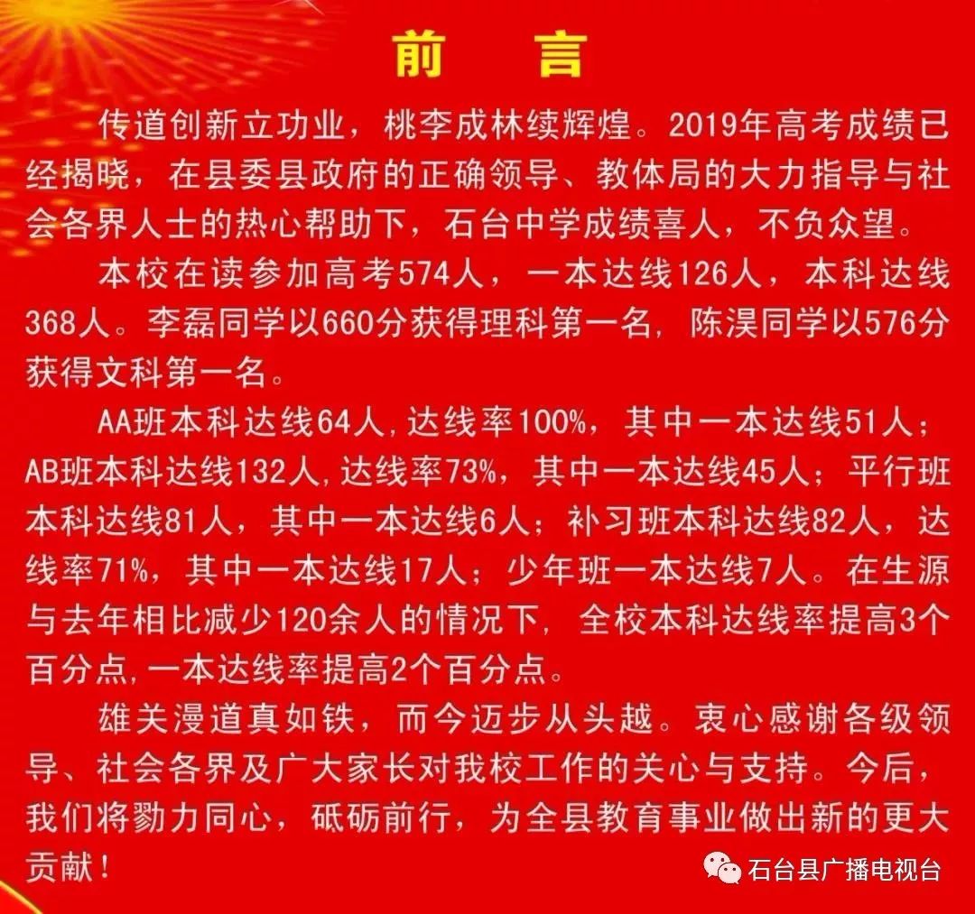 石台中学2019高考成绩喜报、本科一本达线人数情况