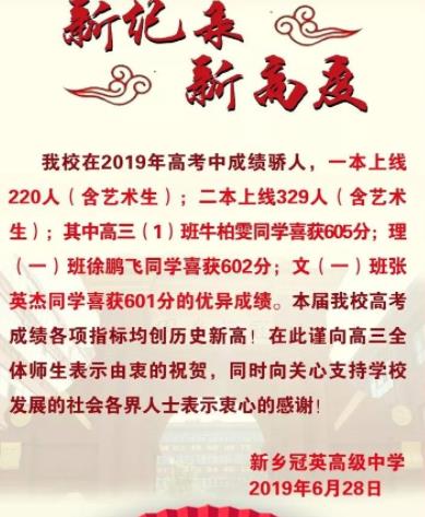 新乡冠英高级中学2019高考成绩喜报、一本二本上线人数情况
