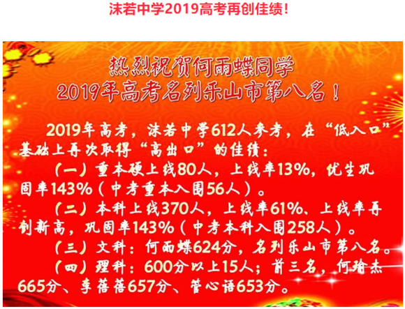 乐山沫若中学2019高考成绩喜报、本科重本上线人数情况