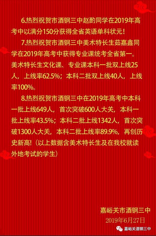 嘉峪关市酒钢三中2019年高考成绩喜报