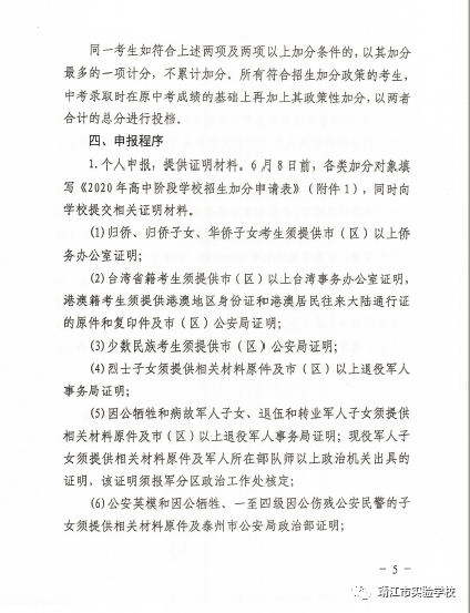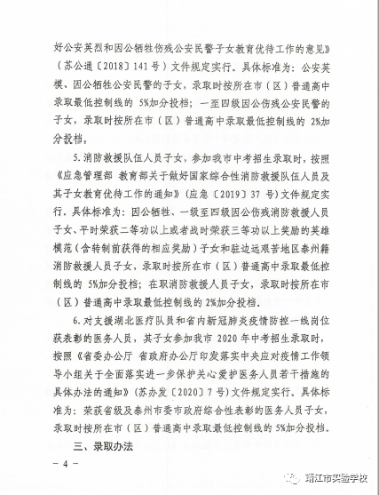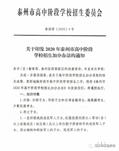 现将泰州市高校招生委员会《关于印发2020年泰州市高中阶段学校招生加分办法的通知》(泰招委〔2020〕4号)转发给你们,并将有关要求通知如下: