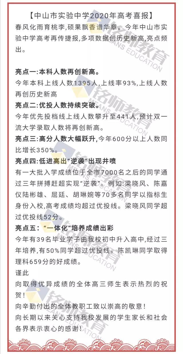 中山市实验中学2020年高考喜报成绩、优投线上线人数情况