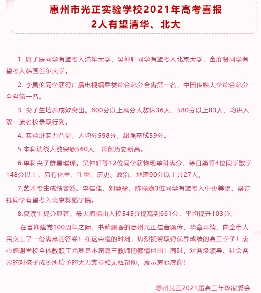 2021惠州光正实验学校高考喜报成绩、本科上线人数情况、特殊控制线(重本线)人数