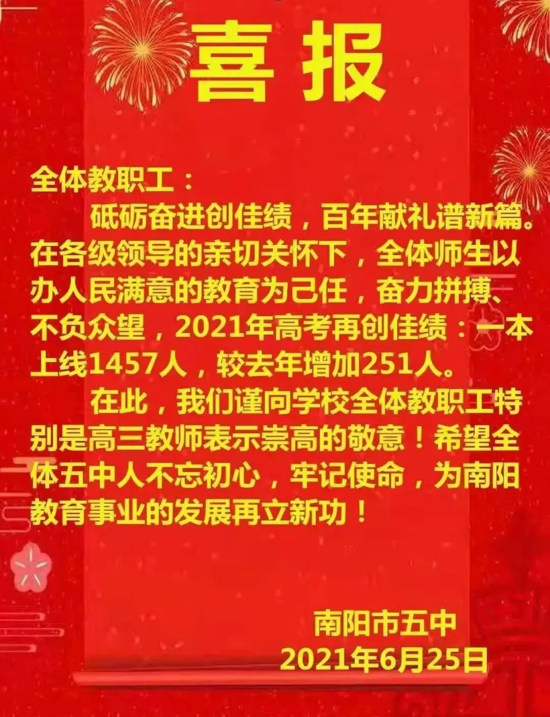 南阳市五中2021年高考喜报成绩、本科一本上线人数情况