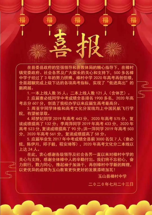 2020玉山樟村中学高考喜报成绩、一本二本上线人数情况