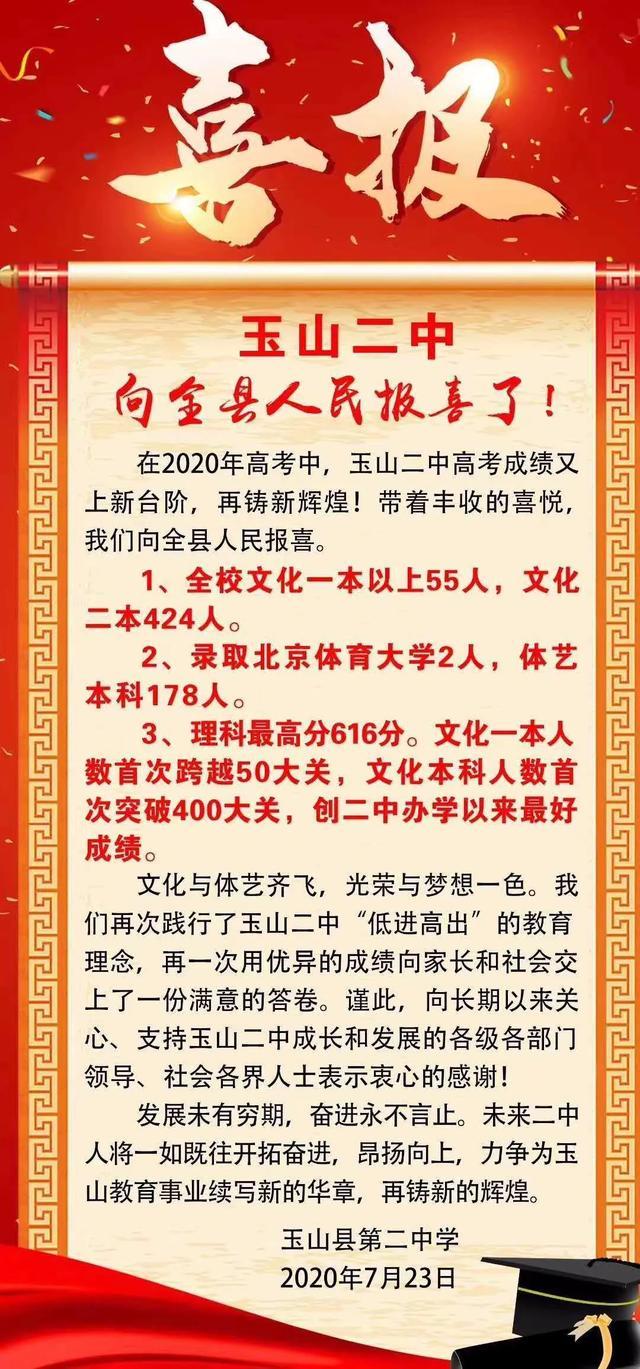 2020玉山二中高考喜报成绩、一本二本上线人数情况