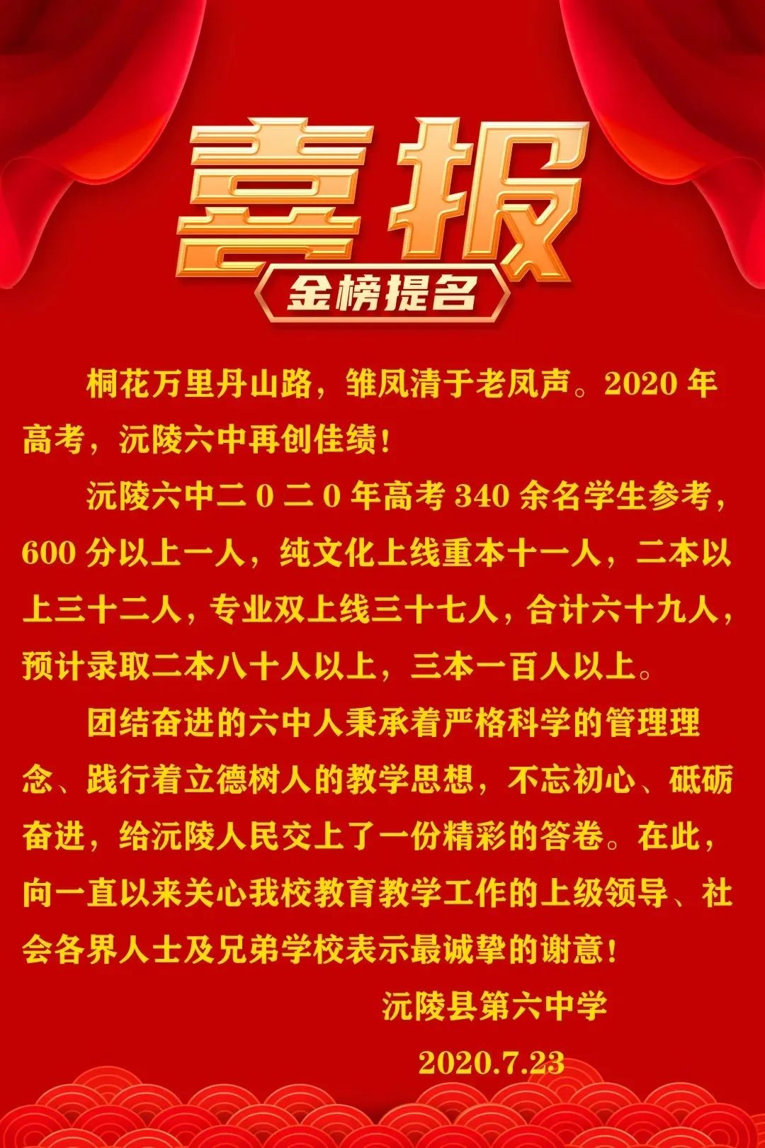2020沅陵六中高考喜报成绩、一本二本上线人数情况