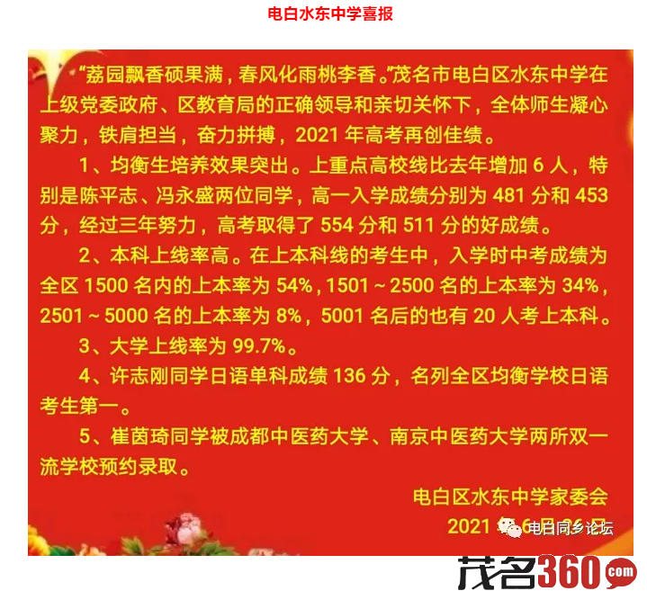 2021电白区水东中学高考喜报成绩、本科特控线上线人数情况
