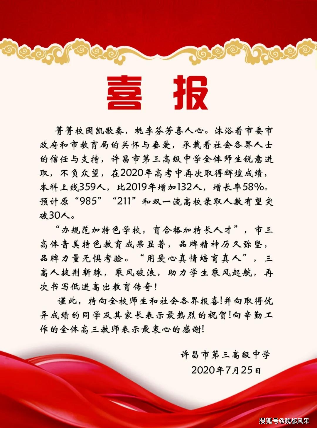 2020许昌市三高高考喜报成绩、本科一本上线人数情况