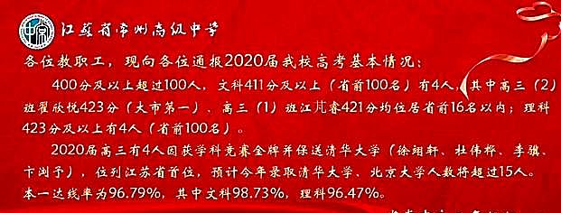 江苏省常州高级中学又称省常中,是省属的重点百年名校、国家级示范高中。2020年高考喜报:一本上线率达到了96.79%,其中文科98.73%、理科96.47%;在高分段方面,400分以上的同学超过100人,8人达到全省前100名,获得全市文科状元,清华、北大的录取人数在15人以上,省常中用自己的高考成绩捍卫了全市中学一哥的地位。