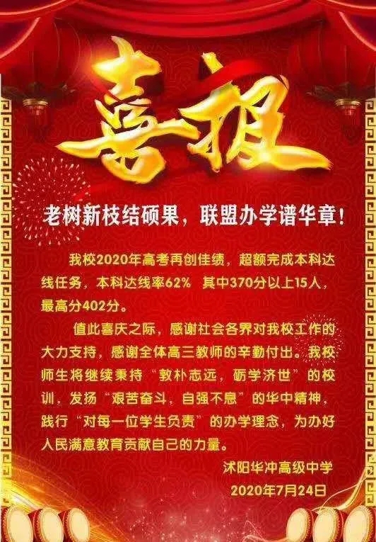 2020沭阳华冲中学高考喜报成绩、本科一本上线人数情况