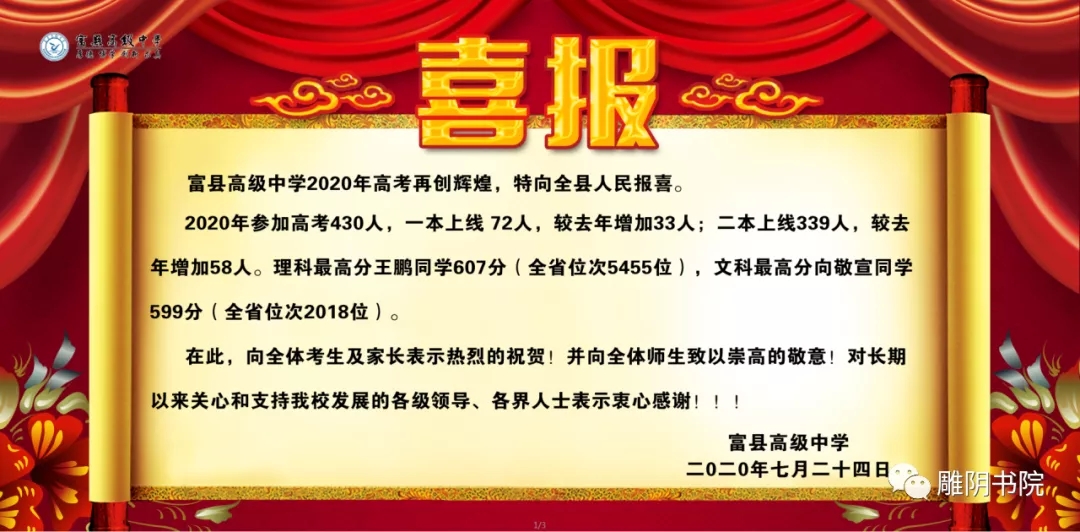 2020富县高级中学高考喜报成绩、本科一本上线人数情况