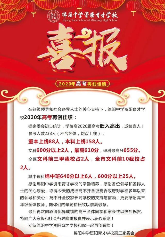 2020绵阳中学资阳育才学校高考喜报成绩、本科一本上线人数情况
