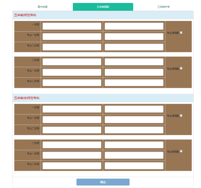 6、 填报中考志愿。通过点击“填报志愿”选项,考生可在此页面填报或修改各批次志愿。为保证考生填报志愿的效率和准确性,考生在填报前,应先认真填写志愿草表,熟悉各批次学校、专业的名称和代码。考生在志愿填报时,应注意在各个批次点击‘确定’按钮,及时保存自己填报的志愿信息。如图: