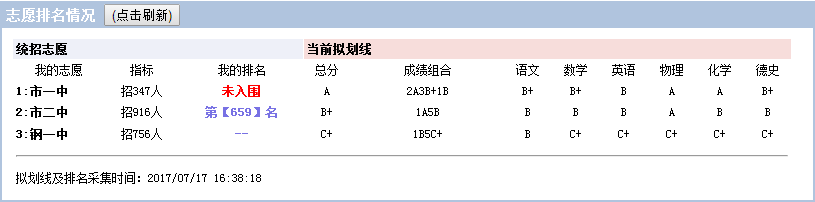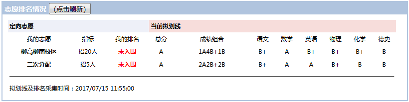 志愿提交成功后,点击【点击刷新】按钮,可以看到填报的志愿学校招生人数和拟划线以及本人排名情况,首次点击刷新需要等待一分钟后再点击刷新才能看到排名情况,点击刷新间隔为5秒。见图5、图6: