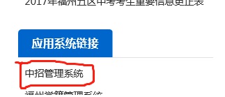 考生登录阳光中招网(http://jyj.fuzhou.gov.cn/zz/zwgk/cswz/fzygzz/),点击页面底部“应用系统链接”下的“中招管理系统”打开登录页面,如图1所示。