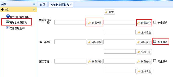 (三)考生点击菜单中的【五年制志愿报考】,可在主界面进行志愿填报