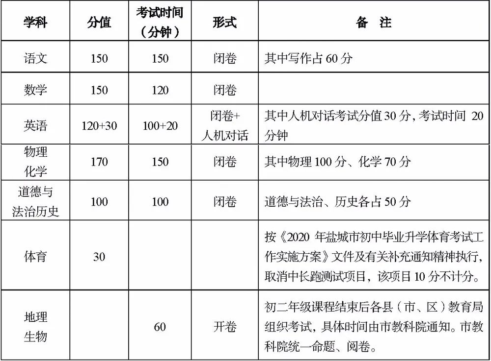 学业水平考试科目包括语文、数学、英语、物理、化学、道德与法治、历史、地理、生物、体育,其中体育考试根据疫情防控要求及省教育厅通知精神,今年取消中长跑测试项目(女子800米、男子1000米),该项目10分不计入总分,今年中考总分为750分,地理、生物考试以A、B、C、D四个等级评定成绩。语文、数学、英语、物理、化学、道德与法治、历史科目的考试由市教育局组织实施,安排在7月14日-16日进行(具体日程见附表);市招生考试中心负责考务工作,集中采用计算机网上阅卷;体育考试按《2020年盐城市初中毕业升学体育考试工作实施方案》(盐教卫〔2020〕12号)及有关补充通知执行。考生各科成绩统一合成后发布。各学科考试形式、分值等见下表。