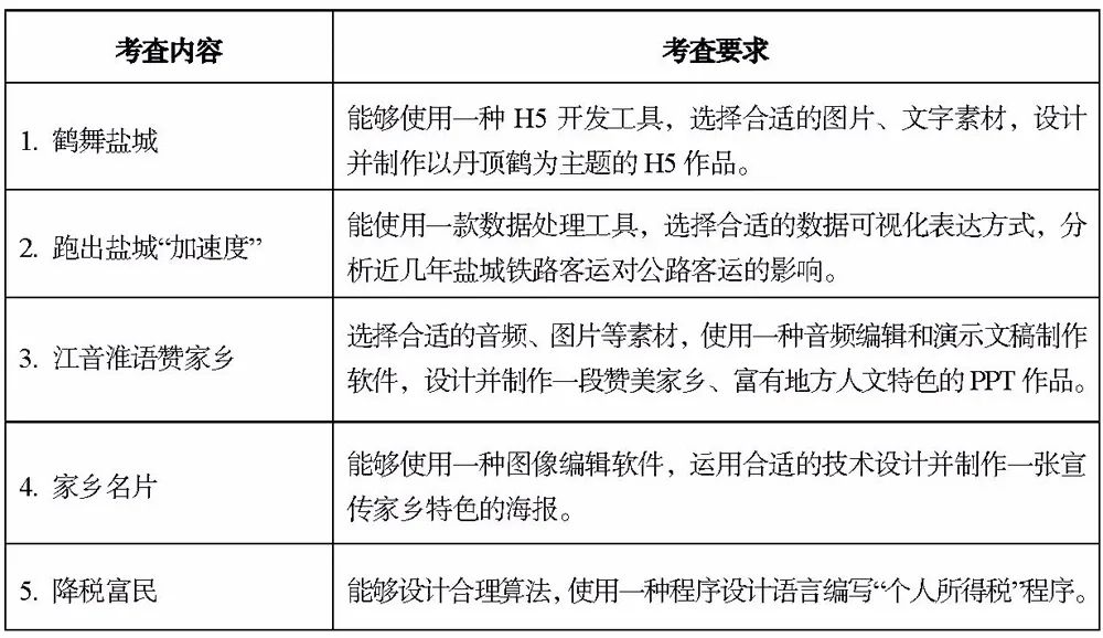 (2)实践技能考查:实践技能考查科目包括信息技术、艺术、劳动与技术、研究性学习等。其中信息技术由市教科院统一命题(实践任务见下表),考查形式为上机操作,各县(市、区)教育局、各学校组织实施,在初二年级的6月份进行。