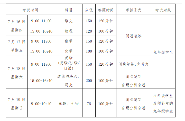 2020兰州中考总分满分、各科目分值、考试时间日期安排