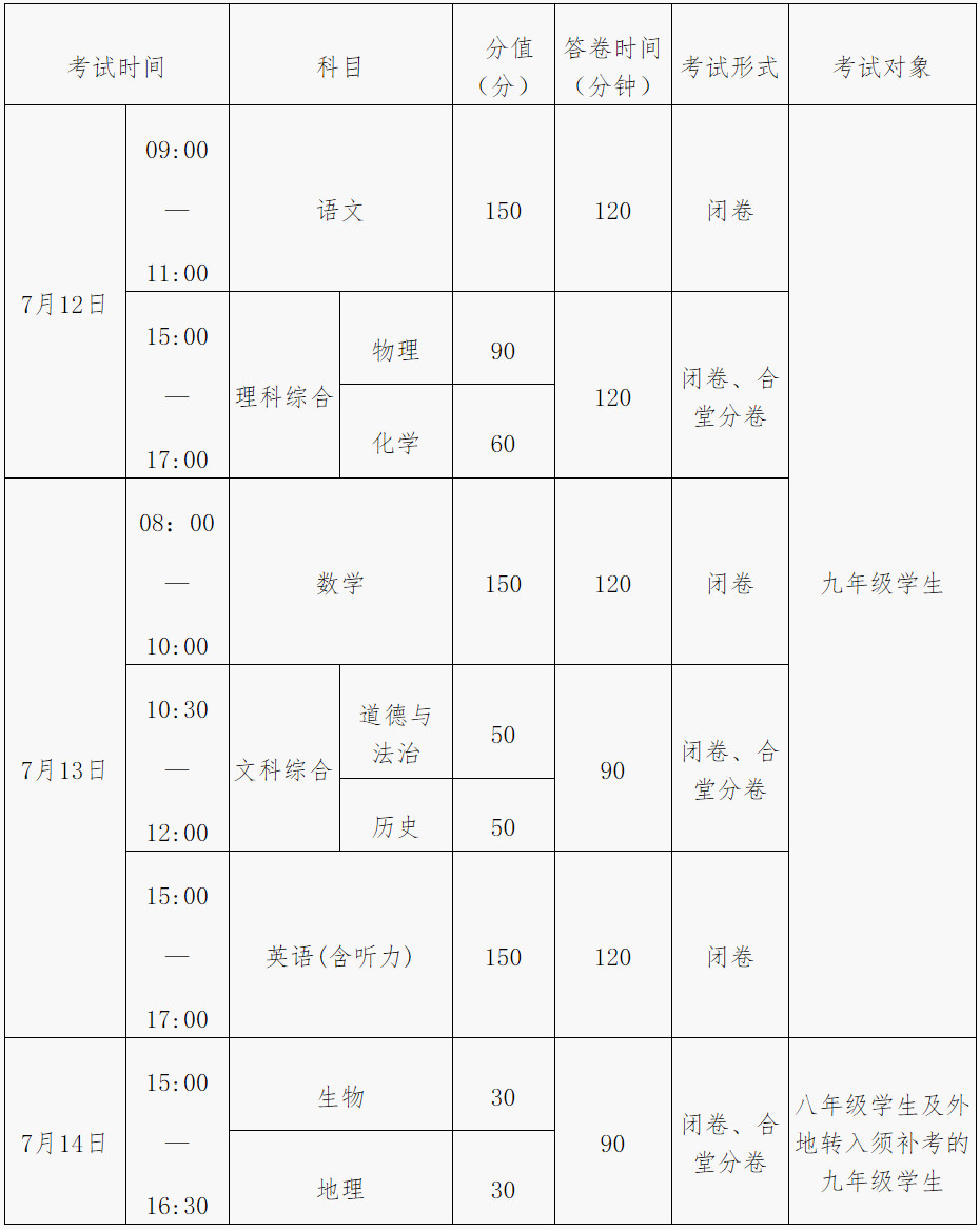 九年级考试:语文、数学、英语(含听力)、文科综合(道德与法治、历史)、理科综合(物理、化学,含实验操作技能)、体育与健康。