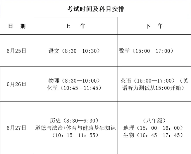 省级统考科目全部实行书面闭卷笔试形式。各科考试时长、卷面满分分值分别为:语文、数学、英语各120分钟、150分值;道德与法治、物理各90分钟、100分值;历史、地理、化学、生物各60分钟、100分值。