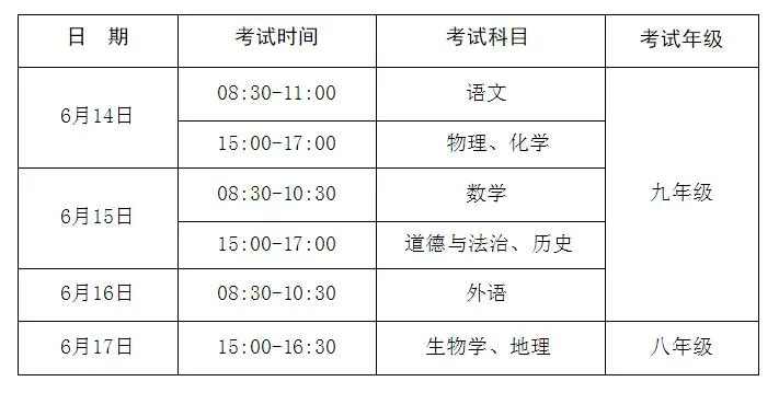 全市九年级物理、化学实验操作考试日期为5月12日—5月16日,八年级生物实验操作技能考试日期为6月22日—6月23日;全市八年级信息技术考试日期为6月17日之后,且总时长不超过一周,具体由各县市区自行决定,市直属初中学校考试时间由市教育局统一安排。