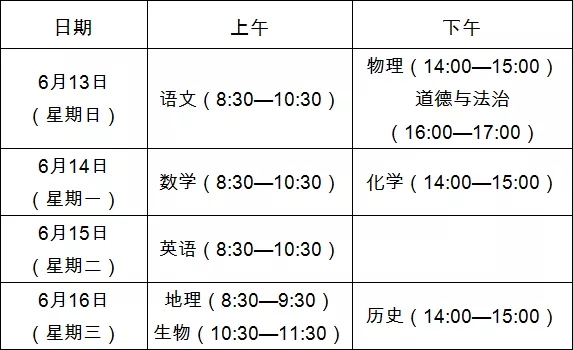 (一)文化课考试。定于6月13日—16日进行,时间及科目安排如下表: