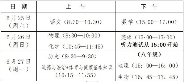 根据《福建省教育厅关于印发福建省高中阶段学校考试招生制度改革实施意见的通知》(闽教基〔2018〕66 号)和《福建省教育厅关于印发福建省初中毕业升学体育与健康考试实施方案(试行)的通知》(闽教体〔2020〕18号)等文件要求,福建省初中学业水平考试(以下简称“中考”)的语文、数学、英语、道德与法治、历史、地理、物理、化学、生物等9个科目及体育与健康基本知识考试实行省级统一考试,全部实行书面闭卷笔试形式。其中,《道德与法治》科目与《体育与健康基本知识》考试同场合卷进行。经研究,2022年中考省级统一考试安排在6月25日—27日举行,具体科目考试时间安排如下:
