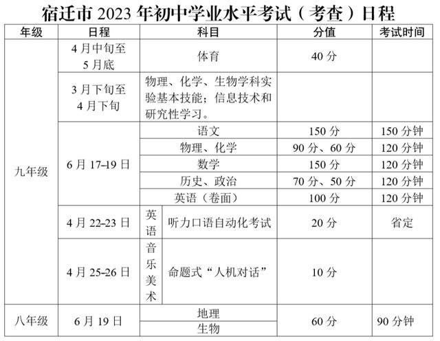 宿迁市2023年初中学业水平考试科目包括语文、数学、英语、物理、化学、历史、政治、体育、音乐、美术及八年级地理、生物。结构及分值为:语文、数学各150分;英语120分,其中笔试100分,听力口语自动化考试20分;物理、化学合卷150分,其中物理90分,化学60分;历史、政治合卷120分,其中历史70分,政治50分,体育40分,音乐5分,美术5分。八年级地理、生物合卷60分,其中地理30分,生物30分。语文考试时间为150分钟,数学考试时间为120分钟,英语(笔试)考试时间为120分钟,物理与化学同场考试,考试时间120分钟,历史与政治同场考试,考试时间120分钟;八年级地理与生物同场考试,考试时间90分钟。