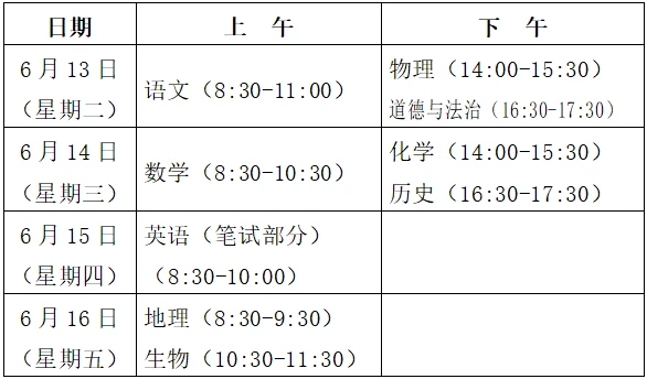 考试科目包括语文、数学、英语(含听说测试)、物理(含实验操作技能)、化学(含实验操作技能)、道德与法治、历史、地理、生物、信息技术10科。各科成绩均以等级方式呈现。