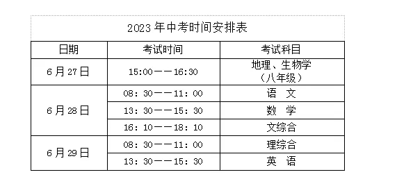 答:中考时间为6月27—29日。