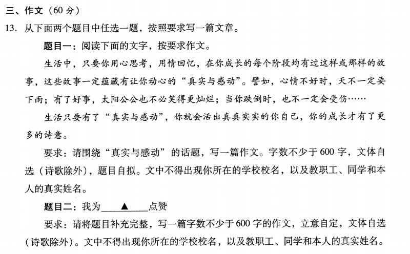 2019年凉山州中考作文题是:真实与感动&我为_____点赞(二选一)。具体详情如下所示: